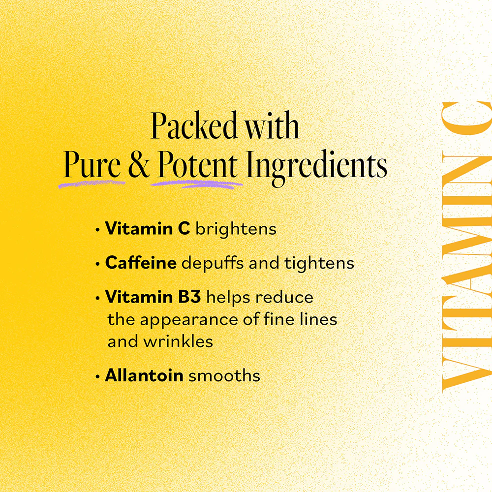 Vitamin C Bright Eyes Hydro Gel Patches (30 pack) wake up tired-looking eyes with a burst of energy. Ideal for quick pick-me-ups, our dermatologist recommended formula has Vitamin C for advanced brightening, Caffeine to reduce puffiness, and calming Cucumber and Aloe to smooth and hydrate.